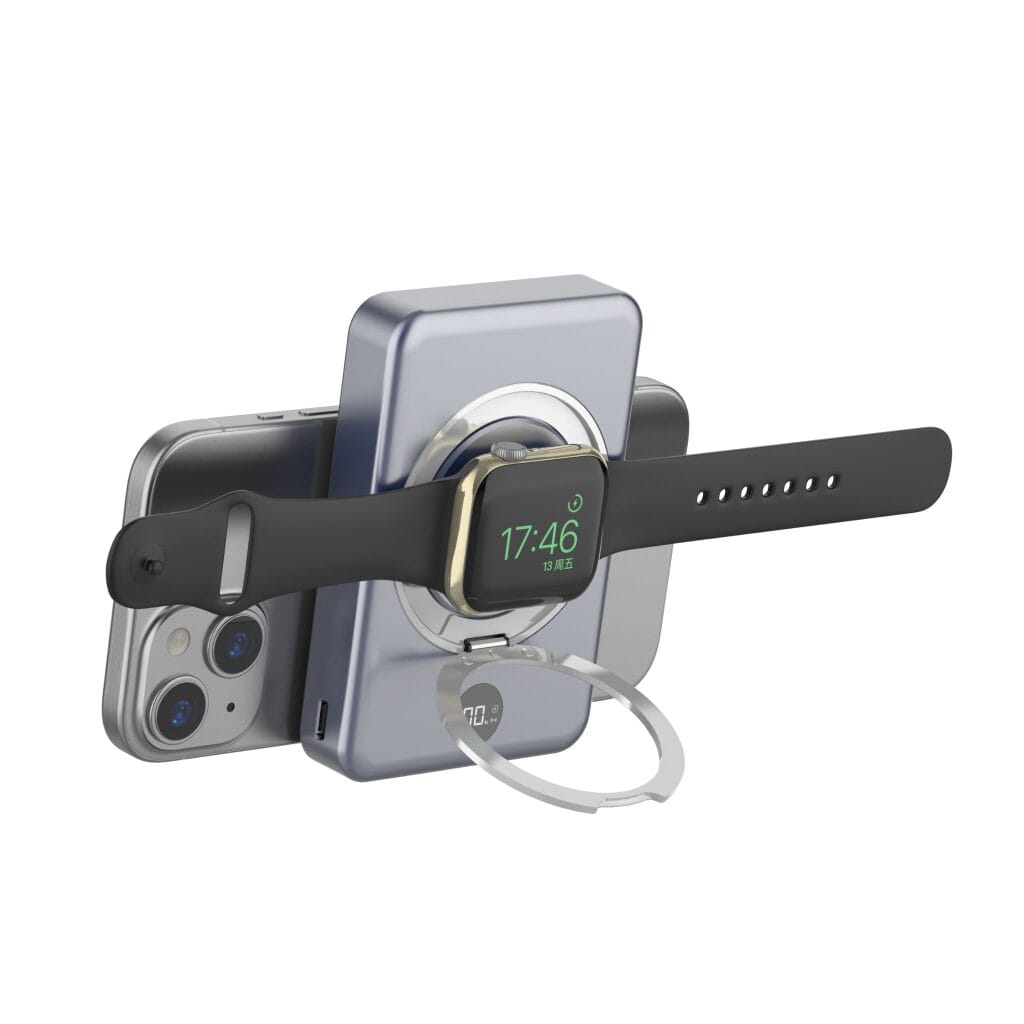 The Noir Amzi is a powerful 10,000mAh, 3 in 1 fast-charging (15W) wireless power bank with magnetic front to ensure phones are held in the optimum position for charging (requires Magsafe for magnets to hold phone in place). Suitable for charging phones and AirPods on the front and Apple watches on the special charging pad on the back. Features a fold down stand for hands-free viewing.